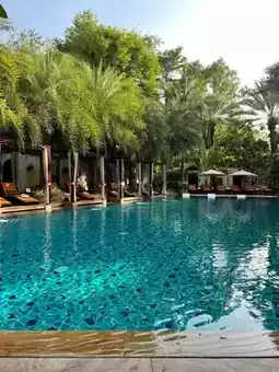 The Palace Gate Hotel & Resort is a highly-rated and acclaimed hotel in Phnom Penh. Its luxurious design blends modern chic with traditional Cambodian charm. The lobby is exquisitely decorated, featuring elegant furniture and unique artwork. The hotel boasts a large swimming pool and a spa with professional services, offering guests a tranquil escape in the bustling city. The views from the windows are stunning, showcasing the cityscape and the hotel's beautifully landscaped courtyard.