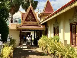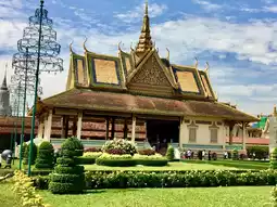 The Royal Palace in Phnom Penh is located in Phnom Penh, Cambodia, situated on the eastern side of the city, facing the confluence of the Mekong River, Tonle Sap River, and Bassac River, forming the Four Arms Bay. The Royal Palace is a complex of buildings, primarily featuring Khmer architectural style with a touch of French colonial influence. It includes the Throne Hall for coronation ceremonies and royal events, the Silver Pagoda for royal Buddhist rituals, and the palace where the Cambodian monarch resides.