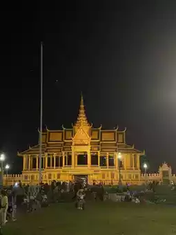 Explored Phnom Penh 🇰🇭 on a city tour and caught some epic vibes right in front of the Royal Palace square at night, the scene there is way cooler than you’d expect! Imagine locals gathering amid palatial Western-style architecture, towering modern buildings, and leafy trees, all glowing under street lights as dusk settles in.