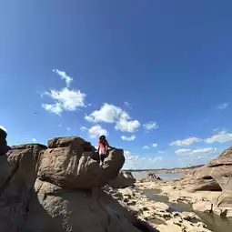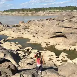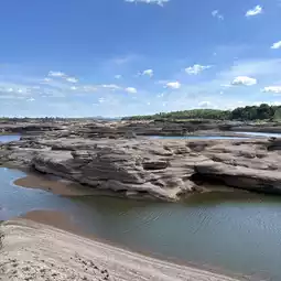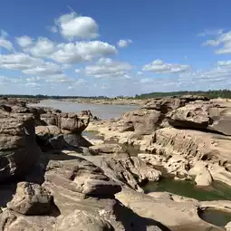 🪨Sam Phan Bok, Ubon Ratchathani Province During low tide, the view of the rocks that used to be submerged in the Mekong River will show its beauty. It is a beautiful and unusual natural view. Especially on a clear day, the brown, gray, and red rocks contrast with the blue sky and white clouds. Take a picture from any angle and it will be beautiful.