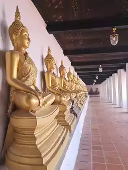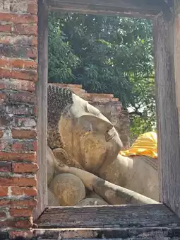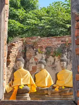 Wat Phutthaisawan, a royal temple in Phra Nakhon Si Ayutthaya, is a must-visit destination when exploring Ayutthaya. This temple was featured in the popular drama 'Buppesannivas,' making it a significant spot for fans to follow in the footsteps of the story. The temple boasts a multi-tiered white tower, golden Buddha statues arranged in all four directions, and ancient ruins and an old chapel that offer a glimpse into the past. The serene atmosphere feels like stepping back in time. Inside the ruins of the chapel, there is a reclining Buddha that exudes an enchanting aura of antiquity. Additionally, the temple is located by the Chao Phraya River, providing a pleasant and picturesque setting.