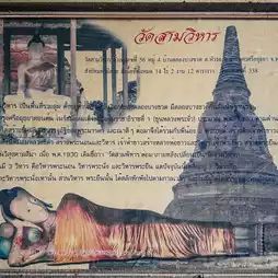 As for the Standing Buddha Temple, it has collapsed over time. In the temple, there is also a large bell-shaped pagoda, approximately 40 meters high, which is a pagoda from the early Ayutthaya period. Influenced by Sukhothai art and 17 carved stone sema stones around the chapel. One in front of the chapel was shot by Phraya Ram's Narai San Suan cannonball, and the marks are still visible today.
