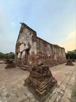 In the evening, Wat Worachettharam has a peaceful and beautiful atmosphere. The sunlight through the ruins of the old pagoda and temple creates beautiful shadows and light, perfect for taking pictures and walking around to experience the tranquility of the place. Although the temple is in a deserted state, it still has interesting architectural elements such as a large bell-shaped pagoda and a temple with a pediment decorated with pottery, reflecting the art of the middle Ayutthaya period.