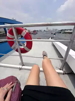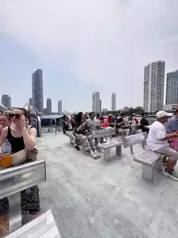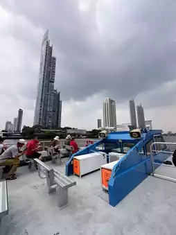 The best views are when you head in the direction towards Sukhumvit—you’ll pass by big hotels, old temples, and local houses right on the water. It’s a cool mix of modern and traditional Bangkok. If you sit outside on the deck, you get the breeze and a great view of everything along the river.