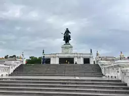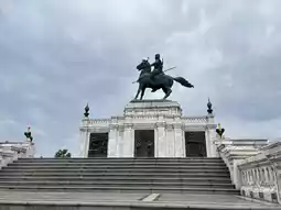 The statue depicts King Naresuan riding a warhorse, placed on a pedestal and surrounded by a white stone courtyard. The monument is three times the size of a regular statue.