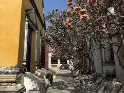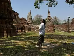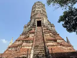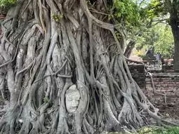 Ayutthaya is a city in Thailand, about 80 kilometers north of Bangkok. It was capital of the Kingdom of Siam, and a prosperous international trading port, from 1350 until razed by the Burmese in 1767. The ruins of the old city now form the Ayutthaya Historical Park, an archaeological site that contains palaces, Buddhist temples, monasteries and statues. The park is on an island between 3 rivers.