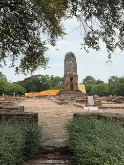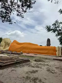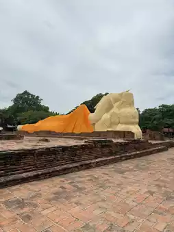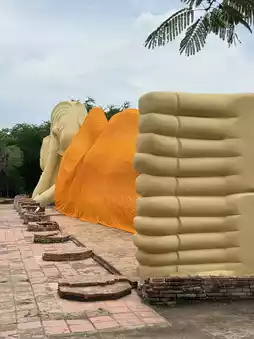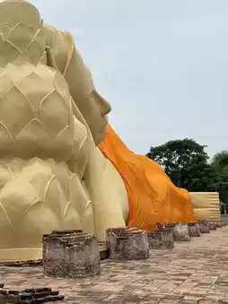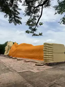 Another ancient temple in Ayutthaya that we highly recommend, Wat Lokayasutharam, is believed to have been built in the mid-Ayutthaya period during the reign of King Nakarindharathirat, the father of Chao Sam Phraya, around 1452 CE. This temple houses the largest reclining Buddha image in the island of Ayutthaya. Located outdoors, this brick and mortar Buddha image measures 42 meters long and 8 meters high. Its face faces north, supporting a lotus flower on its head. Its feet are stacked at right angles, with the toes of equal length. Lotus flowers support the head in place of pillows. It is assumed that this Buddha image was originally bare-chested, but during a renovation in 1996 CE, the head was changed to look like one wearing full attire. Surrounding the Buddha image are 24 octagonal brick pillars. A vihara may have originally been built to enshrine the reclining Buddha, but there is no evidence of its collapse. For those interested in spiritual practices, this is another popular temple for those seeking a cure for bad karma. The temple has parking and is located next to the temple, where you can offer flowers, incense, and candles. #Get a discount without relying on luck #Ayutthaya #ayutthaya #Ayutthaya temples
