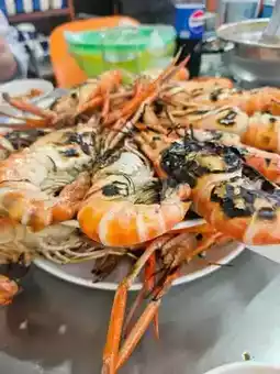We arrived before even entering a temple, so we stopped to refuel at the Central Agricultural Market. Our destination was Goong Puean Praew, famous for its large grilled river prawns with a deliciously spicy dipping sauce. They also offer a wide selection of other dishes, including tom yum, grilled fish, and grilled squid. We were full and ready to go!