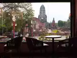 Located opposite Wat Ratchaburana on Maharat Road, the cafe boasts stunning views of the temple through its glass windows on all three floors, particularly the third floor, a popular highlight. The atmosphere is warm and modern Thai, offering a wide selection of beverages, bakery items, and main dishes.
