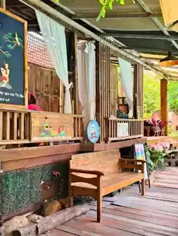 A newly opened restaurant next to the temple with a nice atmosphere and a riverside setting.