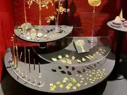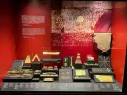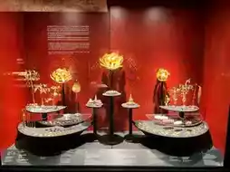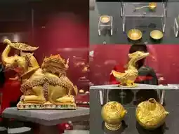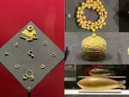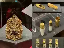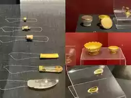 Gold animal figures and various designs, royal swords, gold scabbards decorated with gems, royal utensils, jewelry, and exquisite gold enamel.