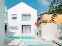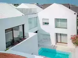The property features an L-shaped layout with private residences, flooded step decks (inspired by Indian step wells), and crisp white gable-roofed structures.