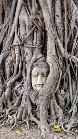 Wat Mahathat, a popular photo spot with the Buddha head nestled in tree roots, symbolizing the return to nature.