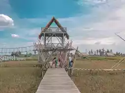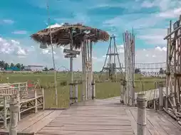 The highlight here is the long bamboo bridge 🌿 connecting to various resting pavilions scattered throughout the rice fields. Some corners have wooden pavilions 🛖 and others have tables under the shade of trees, so you can choose your preferred seating. There's also a bamboo observation tower 🏯 where you can climb up to enjoy the panoramic rice fields, almost like a painting.