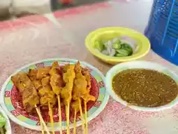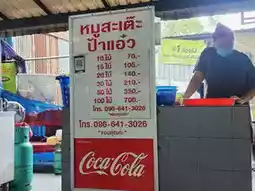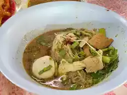 The shop offers both pork and beef noodles, including fresh beef, stewed beef, tom yum, nam tok, and yen ta fone. The broth is rich and fragrant with coconut milk and herbs. The flavors are well-balanced, requiring no additional seasoning. Served with vegetables like bean sprouts and basil, the pork satay is a must-try. The pork is tender and perfectly marinated, and the price is reasonable. They also offer grilled meatballs for a snack, and you can finish off your meal with a delicious Thai steamed custard. This shop is highly recommended for those visiting the temples.