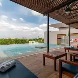 The atmosphere is lush and inviting, with an outdoor pool for relaxing in, or you can order food served by the poolside—it's absolutely delightful! 🥤🍽️