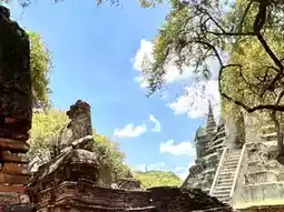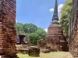 Walking around, you'll also find numerous ancient ruins, including temple walls, the remains of small chedis, and the foundations of old temples. In some corners, large trees interspersed with brick ruins, it's like something out of a movie. The atmosphere is quite peaceful, even with the large number of tourists, you can still feel the sacredness.