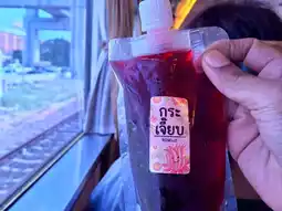 📍 Snacks were available on the train back. It's mango sticky rice with coconut milk. The packaging is incredibly thoughtful and looks very appetizing. It comes with a drink: freshly squeezed orange juice that tastes like real orange juice, not artificially flavored orange juice.
