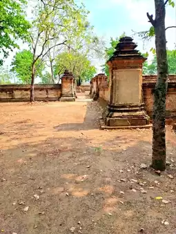 The ancient site, where tourists can visit and take photos, features an ancient vihara, a stupa, and a Buddha image in the Mara-Vijaya posture.