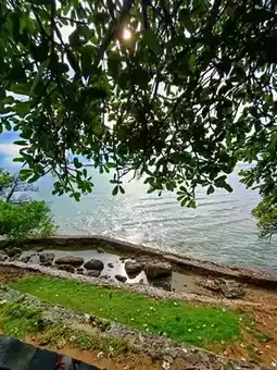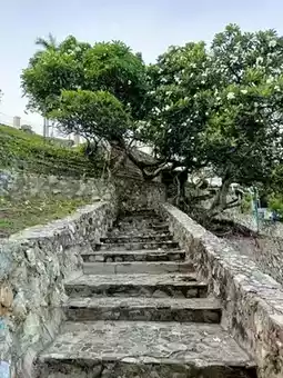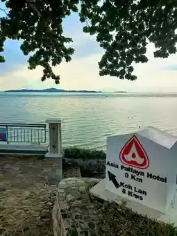 ASIA HOTEL is a beachfront hotel located on a hillside with walkways leading down to two private beaches. There's a viewing point for the sunset, offering stunning sea views and Koh Larn in the distance. The fence is lined with ornamental gardens, and the stairs leading down to the beach are lined with lush, blooming frangipani trees. The view is stunning.