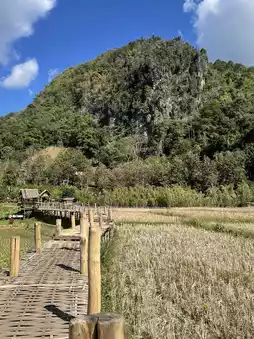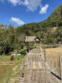 * A long bamboo bridge stretches from the Buddha statue through the fields, allowing visitors to stroll and enjoy the scenic views around the temple.
