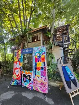 ☕ A cozy cafe decorated with batik fabrics and colored canvas.