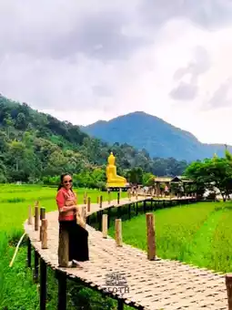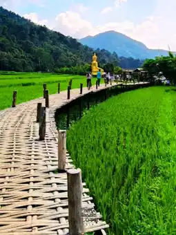 🌻Wat Nakhuha in Phrae Province is a beautiful and peaceful Dharma and nature-based tourist attraction located in a village nestled in a valley surrounded by lush green rice fields and forests. A highlight is the long bamboo bridge that spans the rice fields, perfect for strolling and taking in beautiful photos. The sacred Buddha image, Phra Chao Ton Luang, is enshrined amidst the natural surroundings. It's a perfect spot for worship and taking in the fresh air and ozone. If you visit in the morning or evening, or after a rainstorm, you might catch the mist drifting over the mountains, making the atmosphere even more impressive. There's also a small cafe offering local products like "Khao Kriap Tao" (rice crackers) for souvenirs. This temple offers both peace of mind and beautiful scenery.