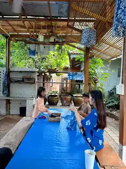 We chose to take the kids to tie-dye at Baan Mat Jai, which also doubles as a cafe. They also offer ceramic painting. Each tie-dye piece costs 150 baht. They'll teach you how to create different patterns. Then, they'll take the kids to dye their shirts by dipping them in a jar filled with indigo dye.