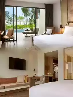 The infinity pool is a must-see! 📸 The crystal-clear water extends to the horizon, merging with the sea, making you feel like a free fish 🐟 as you swim. The private beach is soft and fine, perfect for barefoot running, wave chasing, shell collecting, and sandcastle building. When you're tired, relax on a beach chair with a coconut drink and watch the clouds roll by. ☁️ The children's play area is well-equipped with slides, swings, and climbing frames, ensuring endless fun for the little ones while parents can enjoy a worry-free vacation.