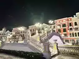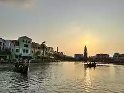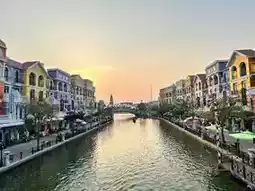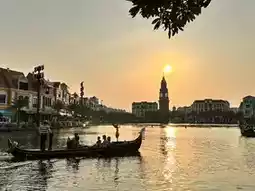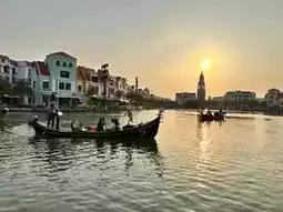 The sunset glow at Phu Quoc Grand World reflects on the gondolas reminiscent of Venice, creating a poetic scene.