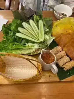 - Cons: It's hard to tell if it's Korean or Vietnamese, and it's crazy because there are so many people. It didn't look that big from the outside, but it was quite big inside. It was divided into the 1st floor and the 1.5th floor, and most of the seats were for 2, 4, and 6 people. Even though it wasn't 5 o'clock, there were quite a lot of people, and 90% of them were Korean. Ta-da~ Banh Xeo appeared. Just seeing the menu appear was ecstatic(?). The vegetables were piled up like a mountain, and there was a lot of food to put inside the spring rolls and vegetables. And those fried things were really, really delicious. Maybe because they were covered in coconut oil, they had a savory flavor. 😀
