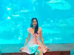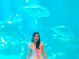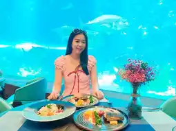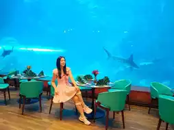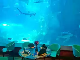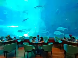 The ambiance of the restaurant is quite elegant and sophisticated, with a calm and serene atmosphere. The decor features green tones that complement the large aquarium filled with various species of fish swimming around. You'll encounter sharks, hammerhead sharks, and many other large and beautiful fish species. It's truly mesmerizing and exciting to watch them swim as you enjoy your meal, enhancing the dining experience by 3000%! The food is delicious, fresh, and of excellent quality, and the service is outstanding, with attentive staff ensuring a great experience.