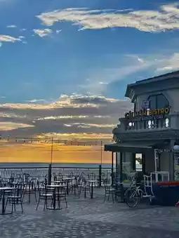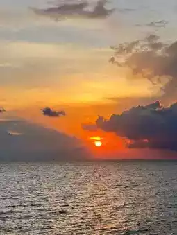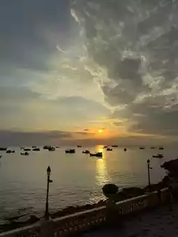 The once bright blue sky gradually transforms into shades of orange, pink, and purple, resembling a breathtaking painting. People gather by the seaside to capture the moment of the sunset as a cherished memory. Couples, families, and tourists alike stand with smiles, soaking in the serene beauty of this magical time.