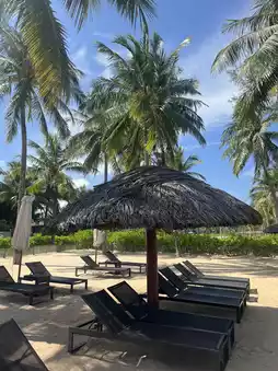 The landscaping, wooden parasols, sunbeds, and other decorations were lovely.