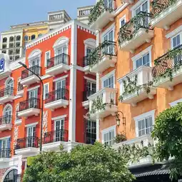 First, when you arrive at 'Ga Ánh Dương (Ánh Dương Station),' you'll be greeted by European-style arch buildings adorned with yellow star decorations. This is the starting point of the cable car, and even just taking photos here will give you some Instagram-worthy shots.