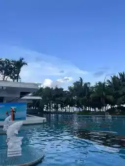 The pool boasts a spacious and open design surrounded by palm trees, giving off the vibe of a small resort. The water is always well-maintained, sparkling under the sunlight during the day and reflecting the serene hues of the sunset in the evening.