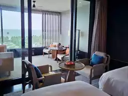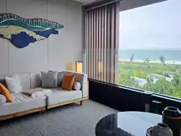 The room type is a sea view twin room, with a large space of 78 square meters. The bedroom connects the living room to the balcony, bringing the outdoor sea view into the room, which is quite an island resort atmosphere. The independent bathroom has a hot water massage pool, and there is an outdoor swimming pool and direct access to the beach outdoors, which is perfect.