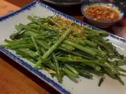 The morning glory stir-fry was delicious as expected, haha. I had high hopes for the banh xeo, but unfortunately, it was served in a way that made it hard to eat, which was a bit disappointing.
