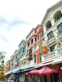 The brightly colored buildings lining the streets are mostly restaurants offering Vietnamese and Korean cuisine, massage and spa services, and hotels and accommodations.
