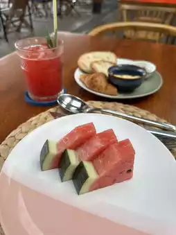 Let me tell you, the food is absolutely fantastic. It's not a buffet, but there’s a menu to choose from, mostly featuring European dishes. My favorite is the sourdough bread with avocado and omelet—so delicious and satisfying!
