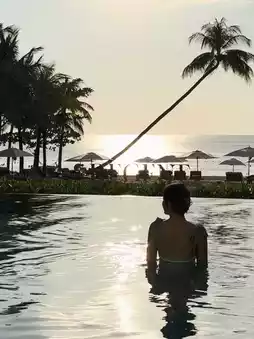 Stepping onto the beach at Phu Quoc Ocean Club, you're greeted by a soft, white sand as fine as powdered sugar, a dreamlike experience. The waters shimmer in a cascading turquoise hue, and the sunlight filtering down, creating a dazzling shimmer that beckons you to plunge into the refreshing waters.