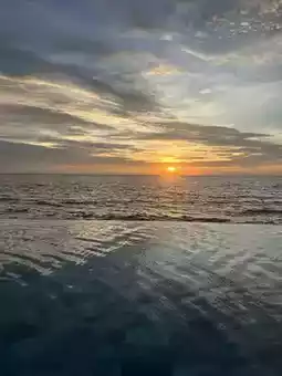 Standing by the infinity pool overlooking the sea, you can watch the sky transform into layers of gold, orange, and soft pink as the sun sinks below the horizon. The water perfectly mirrors the sky, creating a seamless reflection that looks like the edge of the world.