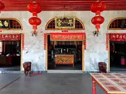 The shrine is based on the architectural style of Chinese shrines. Inside, there are wooden sculptures of Chinese gods and deities.