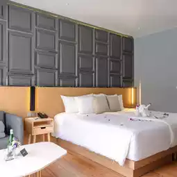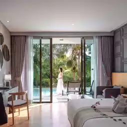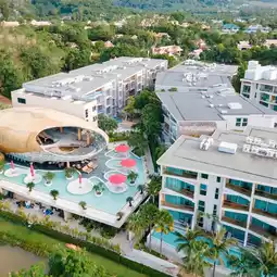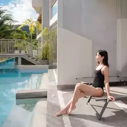 A modern Phuket accommodation with a swimming pool surrounding the hotel, beautifully chic, perfect for taking glamorous photos, the building stands out. Plus it's very shady.