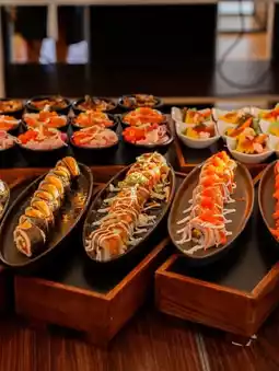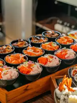 Set up with fresh seafood menus ready to cook by yourself or ready-to-eat menus such as oysters, premium grade meat for barbecue steak, Japanese food stalls with chefs at the counter who will provide sushi, sashimi, hot miso soup that you can help yourself to, salad station, cheese, cold cuts, pasta station, Thai menus such as red pork rice and crispy pork, including a variety of desserts to choose from.