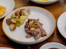 A variety of meat menus to choose from: beef, lamb, pork, chicken, and fish, salad station, mac and cheese, cheese-baked vegetables, bread, soup, dessert, and fresh fruit. Nuch likes lamb, the meat is very soft and juicy.