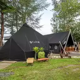 A glamping-style cafe with a chill atmosphere by the sea, cool breeze.