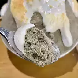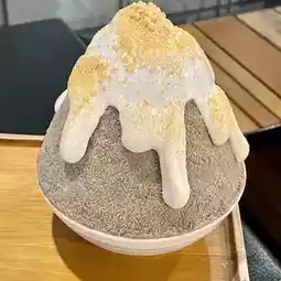 A dessert that combines soft ice, rich Hojicha syrup, and chewy mochi.