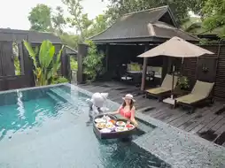 There are pool villas with different styles in each house. This time, Nuch came to stay at Sala Villa, which is a pool villa decorated in Thai style. From the wooden door at the entrance, it makes you feel like you are in a Thai house. When you open the door, you will see the bedroom. It can be opened to the swimming pool. You can jump into the water from the room or sit and swing your feet in the water. Every room is connected from the bedroom to the dressing room to the bathroom. Then you can walk straight into the pool. But the highlight is that there is an outdoor bathtub. Lie down in the warm water, watch the sky or stars at night. Sip a drink, listen to soft music, almost fall asleep in the tub. And inside the room, there is a work desk corner, a sofa corner to sit or lie down and watch TV.