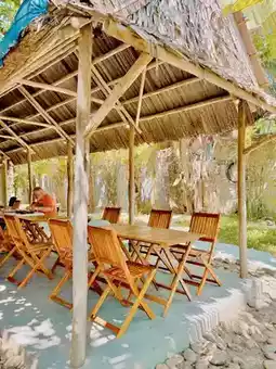 - A large swimming pool in the middle of the island, surrounded by shady trees and a slide for children.